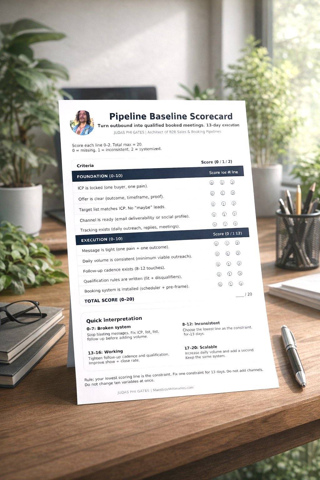 Baseline your pipeline in minutes, spot the weakest link, and follow a simple 13-day plan to turn outreach into booked, qualified meetings.